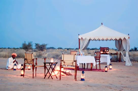 The privately hosted dinner on the dunes is a truly magical and exclusive experience that allows guests to immerse themselves in the enchanting beauty of the desert. As the sun sets over the golden sands of the Thar Desert, this intimate gathering takes place under the vast, starlit sky. The setting is nothing short of breathtaking, and the atmosphere is filled with a sense of wonder and tranquility. It's a moment when time seems to stand still as you dine on sumptuous, carefully prepared cuisine with your loved ones, surrounded by the serene wilderness. The experience is a perfect blend of luxury and nature, offering a profound connection to the desert and an opportunity to create cherished memories that will last a lifetime.